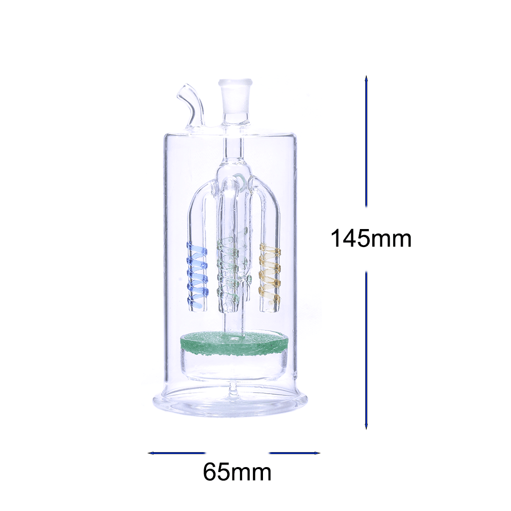 This is a middle sized bottle shaped glass oil burner water pipe, it features the 10mm female joint, 6 inch portable size, bottle shaped, built in tree and honeycomb percolator, the package includes the glass bubbler, whip mouthpiece and bowl.